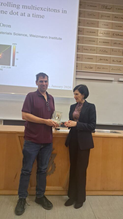 The Faculty of Chemistry was honored to host its annual ceremony last Thursday to present the Kolthoff Prize. This year’s recipient is Prof. Dan Oron, from the Department of Physics of Complex Systems at the Weizmann Institute of Science, recognized for his groundbreaking contributions to nano-photonics, quantum optics, and advanced materials.